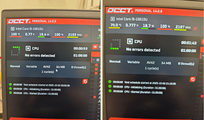 После обслуживания видим что при тех же нагрузках нагрев до 79 градусов, а не 100, уже на 20 градусов холоднее, это при том что на картинке изображен стресс-тест, такая нагрузка в обычной жизни почти никогда не бывает... При обычном наборе кода или офисной работе будет около 46-50 градусов практически с выключенным вентилятором.