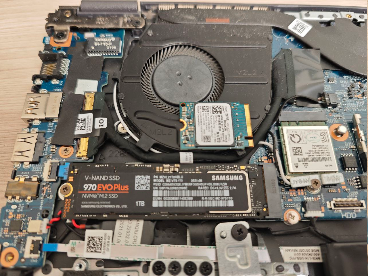 Базово стоит маленький ссд на 256 гиг, в принципе и его хватает, он NVME, но при желанеии он легко меняется на полноразмерные модели, крепление выполнено на защелке и можно переставлять посадочное место под разную длину m2 накопителей.